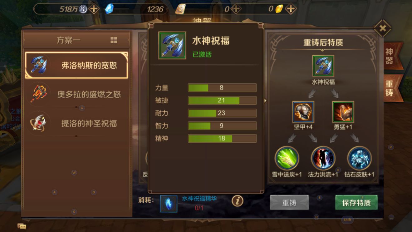 神器重鑄的作用不但可以為只能點(diǎn)1級的某些天賦提供額外的天賦升級點(diǎn)數(shù)。還能提升大量基礎(chǔ)屬性。通過消耗祝福精華,我們可以重鑄神器的特質(zhì),神器只能按箭頭選擇一個(gè)特質(zhì)路線。水神祝福精華通過王者地下城和公會(huì)商店獲取。兩個(gè)水神祝福精華可以通過合成生成一個(gè)火神祝福精華,兩個(gè)火神祝福精華可以合成一個(gè)光神祝福精華。
