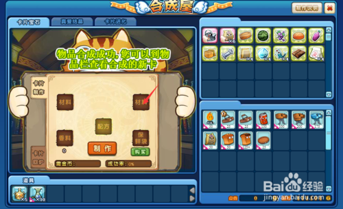 4、對(duì)于綁定的材料道具,我們可以在游戲首頁(yè)點(diǎn)擊“合成屋”,進(jìn)入到道具合成頁(yè)面,在合成頁(yè)面,我們可以將綁定的道具直接移動(dòng)到材料欄使用。