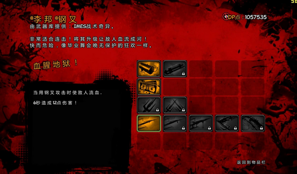 鋼叉,我只升級了三個點:傷害、流血和擊殺獎勵,其實如果完全不升級的話也對進程影響不大,這武器我覺得就是一個雞肋般的存在,當然你偏愛這武器的話,最好多多花一些點放在流血上,其他功能不升級也罷。
