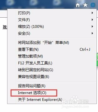 打開IE,找到設(shè)置,再找到【Internet選項】鼠標(biāo)單擊進(jìn)去,如圖所示:
