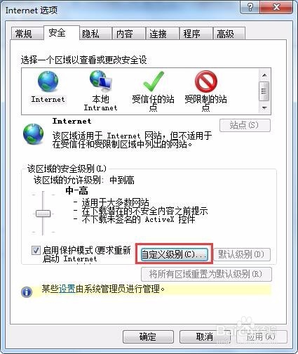 在安全選項卡下點擊自定義級別按鈕,如下圖所示