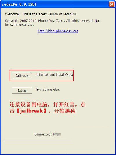 1、連接設(shè)備到電腦,打開紅雪,點擊【jailbreak】,開始越獄