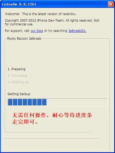 7、進行完以上操作時,redsn0w將完成剩余的工作。完成后,iPhone(iPod touch,ipad)將自動重啟。