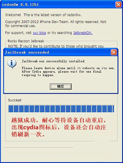 最后紅雪會提示你越獄成功,但是需要按照它來引導(dǎo)設(shè)備啟動: