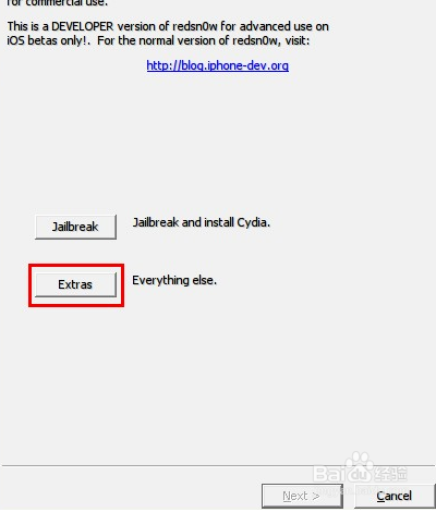 打開紅雪(Redsn0w),點擊“Extras(其他)”【W(wǎng)in7系統(tǒng)請右鍵使用管理員身份運行】: