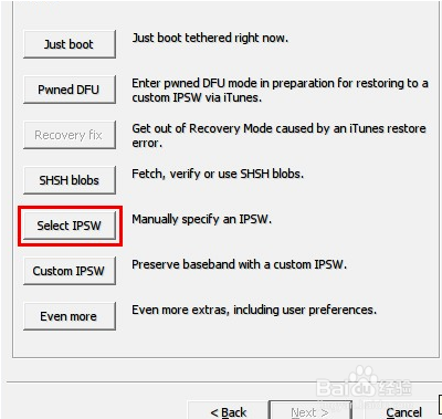 3、啟動redsn0w軟件,選擇extra - select ipsw,選擇你的固件。點擊back。