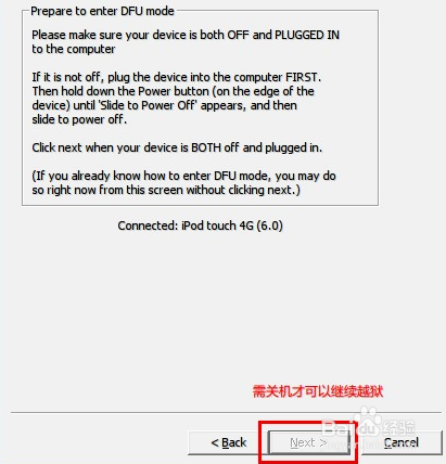 此時將設(shè)備接入電腦,然后按住電源鍵,滑動出現(xiàn)的滑塊來關(guān)機,最后點擊“Next(下一步)”: