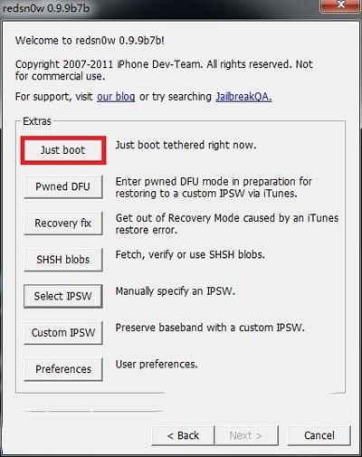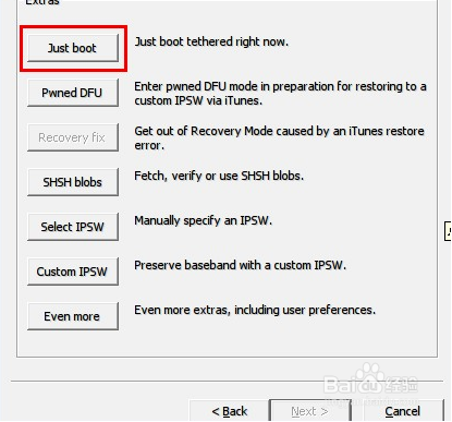再次打開紅雪,重復(fù)上面的步驟選擇6.0的固件,識別之后依次點擊“Extras(其它)”、“Just boot(引導(dǎo)啟動)”。然后按照屏幕提示進行操作即可完成引導(dǎo)啟動