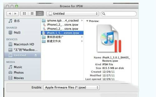 打開iTunes,將提示你有在恢復(fù)模式的iPod,按住鍵盤shift點iTunes界面上的恢復(fù),找到下載好的patchedFW.ipsw 并恢復(fù)。
