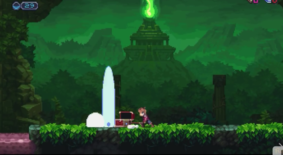 3、蹬墻跳:類似洛克人X系列及之后作品和月輪中的爬墻。貼住墻體會減速,此時可以(只能)向外再跳一次,在貼近的兩面墻中可以采用Z字往返跳向上攀爬。只能向外跳導致不太方便,尤其是和攀墻容易混用。