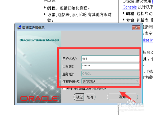 點(diǎn)擊后,彈出登陸窗口,這塊需要用dba管理用戶登錄,sys用戶登錄即可