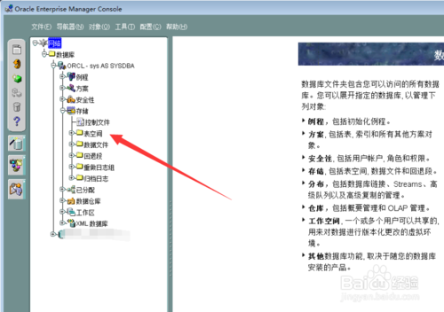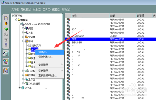 登陸成功后,點(diǎn)擊存儲(chǔ),存儲(chǔ)節(jié)點(diǎn)下找到表空間,在表空間上右鍵操作點(diǎn)擊創(chuàng)建
