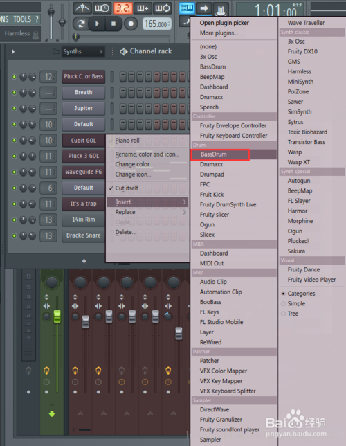 關(guān)閉 FL Studio 插件管理器,回到界面,在任一通道上右擊,選擇插入或替換,即可看到我們?yōu)g覽到的更多插件,如 BassDrum。