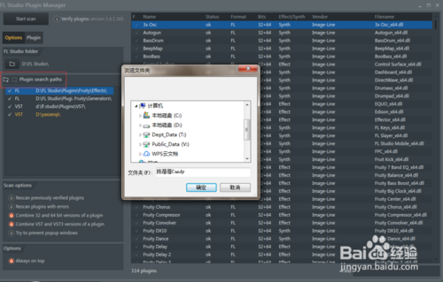 彈出插件管理器窗口,點擊右下角的管理插件,彈出水果軟件自帶的 FL Studio 插件管理器,設(shè)置好掃描路徑或添加路徑,當加入一個路徑以后,前面選框勾選則代表被激活,將會掃描到這個路徑。