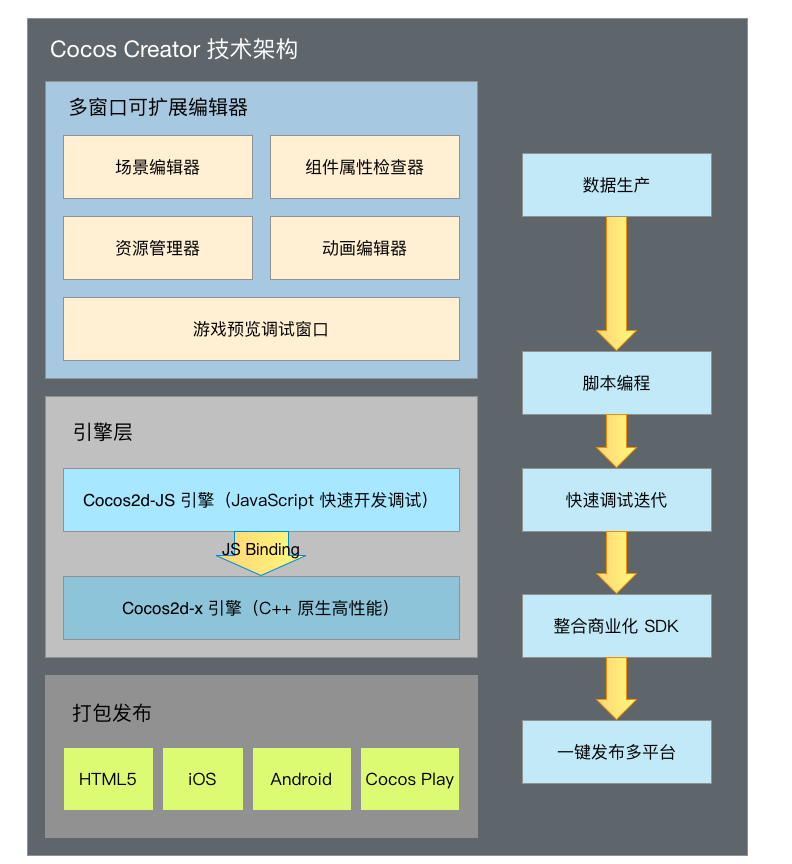 在開發(fā)階段,Cocos Creator 已經(jīng)能夠?yàn)橛脩魩砭薮蟮男屎蛣?chuàng)造力提升,但我們所提供的工作流遠(yuǎn)不僅限于開發(fā)層面。對于成功的游戲來說,開發(fā)和調(diào)試、商業(yè)化 SDK 的集成、多平臺發(fā)布、測試、上線這一整套工作流程不光缺一不可,而且要經(jīng)過多次的迭代重復(fù)。
