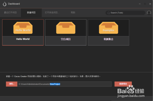新建項(xiàng)目: 選擇這個選項(xiàng)卡,會進(jìn)入到 Cocos Creator 新項(xiàng)目創(chuàng)建的指引界面。
