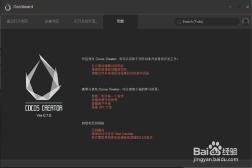 最近打開項(xiàng)目: 列出最近打開項(xiàng)目,第一次運(yùn)行 Cocos Creator 時(shí),這個列表是空的,會提示新建項(xiàng)目的按鈕。