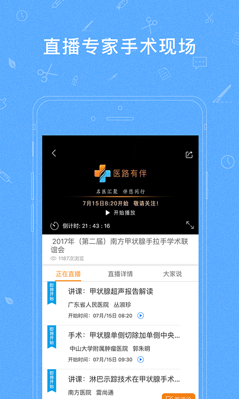 「醫(yī)路有伴」是廣州杏雨科技有限公司專為廣大醫(yī)生及醫(yī)學(xué)生量身定制的APP,自主研發(fā)高碼流低延時(shí)流媒體直轉(zhuǎn)播系統(tǒng),解決高清3D、2D腔鏡視頻和現(xiàn)場對話,多畫面雙向直播,直接交流手術(shù)中的疑難問題和處理關(guān)鍵,實(shí)現(xiàn)終端用戶任何時(shí)間、任何地點(diǎn)享受高質(zhì)量、全方位手術(shù)教學(xué)資源分享。「醫(yī)路有伴」將以學(xué)科頂尖專家分享、交流前沿理念和心得經(jīng)驗(yàn),幫助同道提升臨床診療水平,輕松、高效陪伴您成長之路!