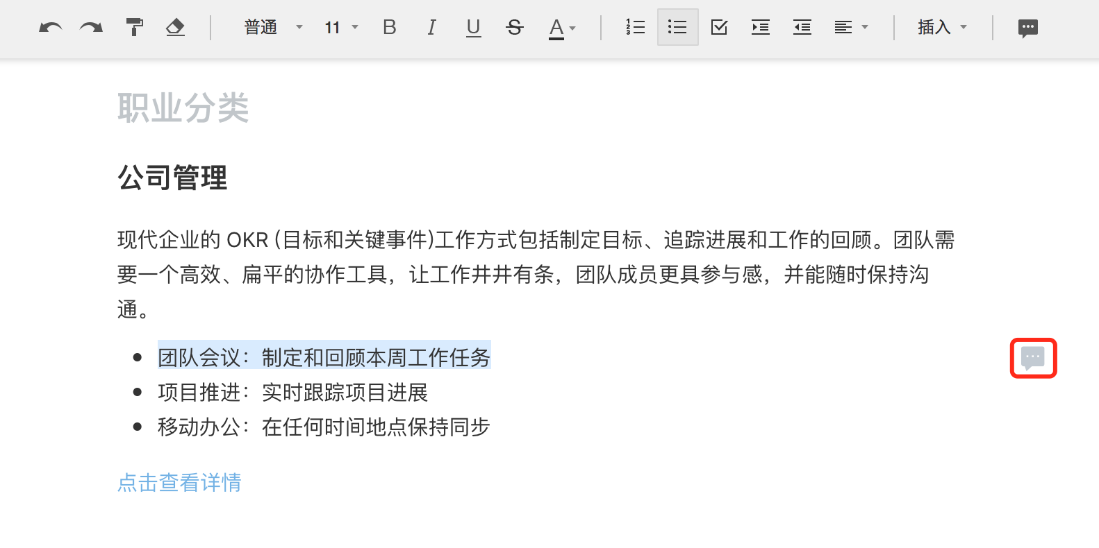 針對(duì)文檔的某一細(xì)節(jié)內(nèi)容,你可以劃詞評(píng)論。這非常適合運(yùn)營(yíng)和產(chǎn)品團(tuán)隊(duì)用來討論方案。你也可以用@功能向小伙伴喊話或提及一個(gè)文檔 。