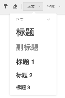 在文檔里選中相應(yīng)的內(nèi)容標(biāo)題后,點(diǎn)擊文檔左上方設(shè)置目錄的按鈕(正文),即可完成文檔目錄的設(shè)置。目前有「 正文 」、「 標(biāo)題 」、「 副標(biāo)題 」、「 標(biāo)題1 」、「 標(biāo)題2 」、「 標(biāo)題 3」五種目錄選項(xiàng),如下圖所示:
