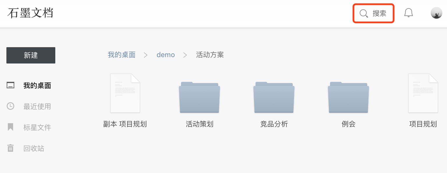 在石墨桌面右上方有一個(gè)「 搜索 」按鈕(見下圖),點(diǎn)擊后即可進(jìn)行文檔搜索。