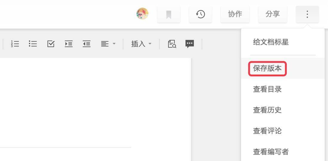 點(diǎn)擊文檔頁(yè)面中右上方的更多「 … 」按鈕,在更多選項(xiàng)中點(diǎn)擊「保存版本」即可將文檔目前的內(nèi)容狀態(tài)創(chuàng)建一個(gè)版本,如下圖: