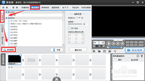 4、接下來(lái)依次選擇【疊加素材】→【加貼圖】→【添加貼圖】,以貼圖形式添加圖片。