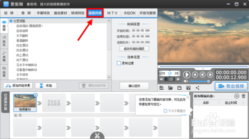 2、在愛(ài)剪輯最上方的菜單中找到【畫(huà)面風(fēng)格】。然后操作頁(yè)面會(huì)自動(dòng)切換到【畫(huà)面風(fēng)格】頁(yè)面下,開(kāi)始設(shè)置。