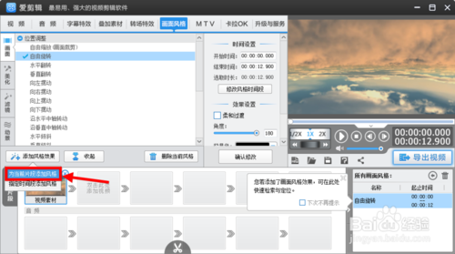 3、點(diǎn)擊選擇【添加風(fēng)格效果】,然后根據(jù)自己的需求進(jìn)行【風(fēng)格添加】,可以對(duì)整個(gè)視頻片段進(jìn)行設(shè)置,也可以對(duì)視頻中某一個(gè)片段進(jìn)行設(shè)置哦。