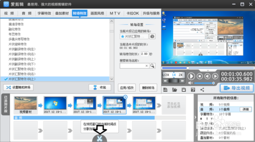 5、如果是一個(gè)比較長(zhǎng)的視頻,也可以使用將視頻轉(zhuǎn)折處剪掉,裁下的視頻自動(dòng)加載在后面,這樣就可以使用專(zhuān)場(chǎng)效果了(選中后一個(gè)視頻設(shè)置轉(zhuǎn)場(chǎng)特效)。