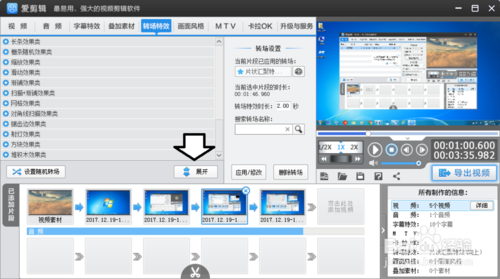 6、收起只顯示轉(zhuǎn)場(chǎng)特效的分類(lèi),展開(kāi)才可以使用分類(lèi)底下的轉(zhuǎn)場(chǎng)特效模板。
