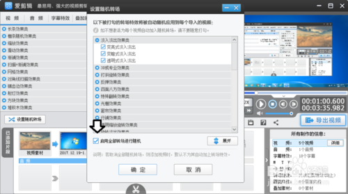 7、注意一定要選中設(shè)置隨機(jī)轉(zhuǎn)場(chǎng),并勾選啟用全部轉(zhuǎn)場(chǎng)進(jìn)行隨機(jī)(如果看到效果不佳的隨機(jī)轉(zhuǎn)場(chǎng)特效,可以自行刪除并切換合意的模板),否則是無(wú)轉(zhuǎn)場(chǎng)效果。