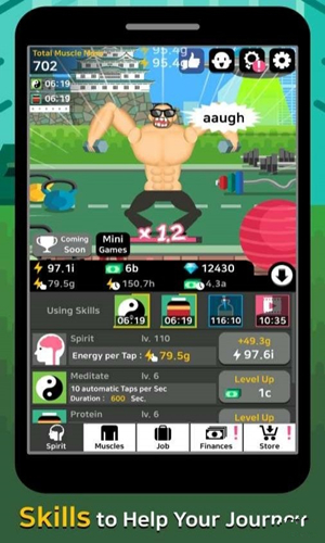 2、使用各種各樣的技能獲得更大的收益,快速成為肌肉王;