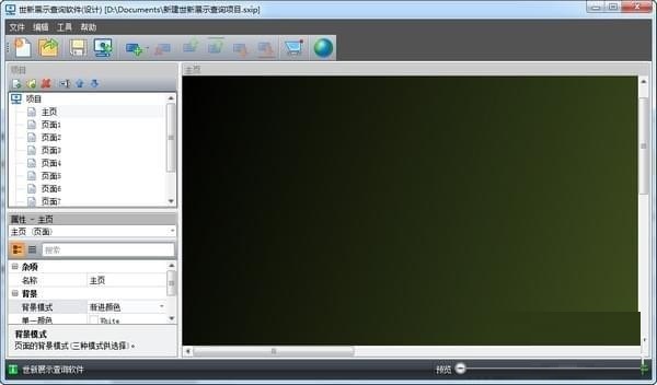 新建項(xiàng)目時(shí)軟件自動(dòng)在項(xiàng)目中添加11個(gè)頁(yè)面,如果展示項(xiàng)目需要更多的頁(yè)面,請(qǐng)點(diǎn)擊項(xiàng)目窗口工具條的“新建頁(yè)面”按鈕,如下圖所示: