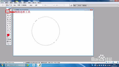 點(diǎn)擊左邊面板上的橢圓選框工具,在文檔中間畫(huà)一個(gè)正圓。