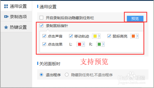 點擊更多設(shè)置可以進入另一個頁面,這個頁面也包含許多功能參數(shù),其中一個錄制鼠標指針的功能有多種選擇還可以支持預(yù)覽。