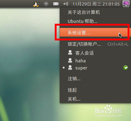 進入ubuntu桌面右上角按鈕菜單中選擇“系統(tǒng)設(shè)置”。