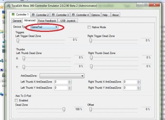 設(shè)好按鈕和推桿后,把Advanced里的Device Type設(shè)定為Game Pad。