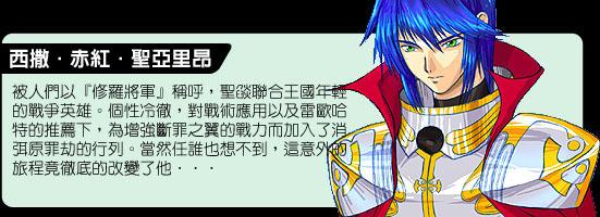 西撒.赤紅.圣亞里昂,南方圣焰聯(lián)合王國中,圣亞里昂領的少主,同時也是圣焰英雄雷歐哈特的獨子。在圣焰與西方異邦數(shù)年來的戰(zhàn)斗中,多次展現(xiàn)其優(yōu)越的指揮能力,屢屢大破對手陣營,贏得多次壓倒性的勝利,有“修羅將軍”的稱號。