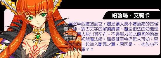 愛斯玲.綠.圣亞里昂 圣焰的英雄-雷歐哈特之女,同時也是修羅將軍-西撒之妹。雖身為女兒身,但在其父與其兄諸多英雄事跡的渲染下,愛斯玲亦有著一手習自摯友幽彌的百步穿楊、巧射弓技。