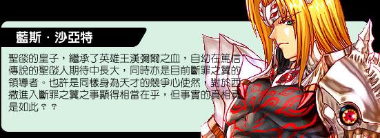 圣焰聯(lián)合王國之王-杰奧斯的獨子,同時也是傳說中的英雄王漢彌爾僅存的唯一后裔。身為圣焰長老院公認的圣焰王唯一繼承人,藍斯自小便有著超越同齡競爭對手的優(yōu)越表現(xiàn):從劍技到指揮調度的能力,都是當之無愧的少年英雄。