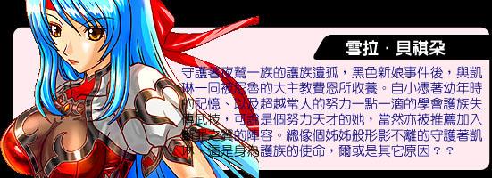 “黑色新娘的悲劇”發(fā)生后,守護魔女亞蒂瑪?shù)摹白o之一族”幸存者。遵循著古老的契約,自凱琳尚年幼之時,便一直守護在她身邊。對年幼即逢喪母之痛的凱琳而言,雪拉就如同自己的親姐姐一般重要。