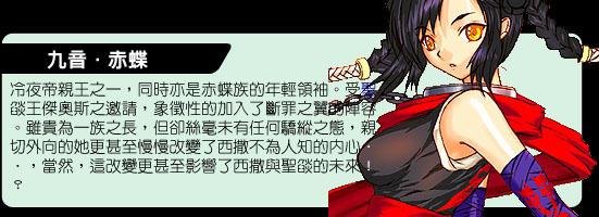 代表著冷夜帝國的三大族-雪狼、焰梟與赤蝶族中,率領著赤蝶族的19歲少女。因其父母均早逝于數(shù)年前的冷夜建國戰(zhàn)爭之故,自幼便被迫扛起族長之責的她有著強于他人數(shù)倍以上的責任感。