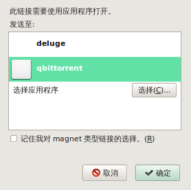 我之前選擇了Qb,所以有Qb選項。你沒的話,點擊“選擇”,進入/usr/bin/下選擇qbittorrent就可以了。在“記住我對magnet類型連接的選擇”前打鉤,下次火狐就會自動調(diào)用Qb下載磁力連接了