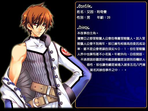 彌賽亞之都冒險(xiǎn)獵人公會的專屬冒險(xiǎn)獵人。加入冒險(xiǎn)獵人公會不到兩年,卻已擁有相當(dāng)高的委托成功率,雖不是公會里頭的頂尖NO.1,但是在冒險(xiǎn)獵人界中也算有著不小名氣。年輕外向、自信開朗,不過那說好聽是好相處;說難聽是沒原則的爛好個性,卻也讓他總是被卷入諸多五花八門兼莫名其妙的事件之中……