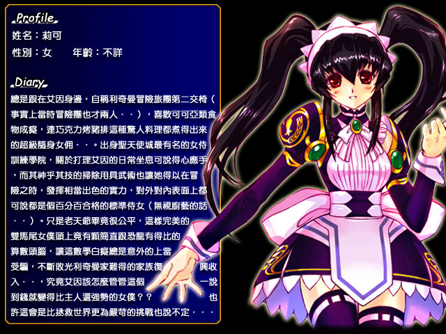 總是跟在艾因身邊,自稱利奇曼冒險(xiǎn)旅團(tuán)第二交椅(事實(shí)上當(dāng)時冒險(xiǎn)團(tuán)也才兩人),喜歡可可亞類食物成癡,連巧克力烤豬排這種驚人料理都煮得出來的超級隨身女傭。出身圣天使城最有名的女侍訓(xùn)練學(xué)院,關(guān)于打理艾因的日常作息可說得心應(yīng)手,而其相當(dāng)出色的實(shí)力,對外對內(nèi)表面上都可說是個百分百合格的標(biāo)準(zhǔn)侍女(無視廚藝的話……)。