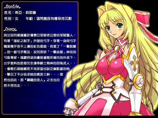 與艾因同樣隸屬于彌賽亞冒險(xiǎn)者公會的冒險(xiǎn)獵人,有著「焰紅之射手」外號的弓手。穿著一身與弓手職業(yè)幾乎搭不上邊的紅色重鎧,舍棄了「一擊脫離」的一般弓手戰(zhàn)法,反而深研「一擊必殺」神技的弓術(shù)專家。