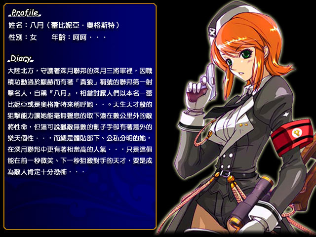大陸北方,守護(hù)著深月聯(lián)邦的深月三將軍中,因功勛顯赫而有著「貪狼」稱號的聯(lián)邦第一射擊名人,自稱『八月』,相當(dāng)討厭人們以本名——蕾比妮亞或是奧格斯特來稱呼她。