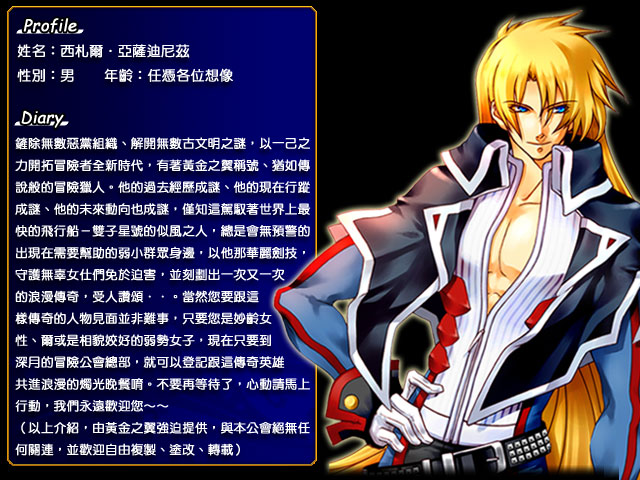 鏟除無數(shù)惡黨組織、解開無數(shù)古文明之謎,以一己之力開拓冒險(xiǎn)者全新時代,有著黃金之翼稱號、猶如傳說般的冒險(xiǎn)獵人。他的過去經(jīng)歷成謎,僅知這駕駛著世界上最快的飛行船——雙子星號的似風(fēng)之人,總是會無預(yù)警地出現(xiàn)在需要幫助的弱小群眾身邊,以他那華麗劍技,守護(hù)無辜女士們免于迫害,并刻劃出一次又一次的浪漫傳奇,受人贊頌。