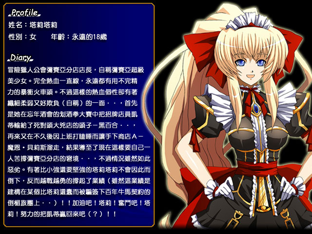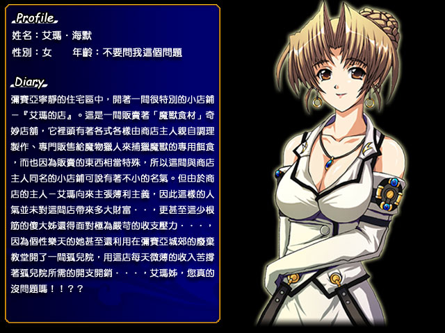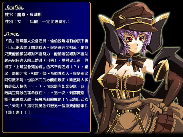 『前』冒險(xiǎn)獵人公會店員,偷偷脫離塔莉的旗下后,自己跑去開了間刻紋店。與塔莉完全相反,是個只要能偷懶就絕對不會努力,能躺著就絕對不會站起來招待客人的天然派(自稱),堪稱史上第一個得了『上班就會死的病』的不幸商店娘(?)??傊?,是個非常、相當(dāng)、很——有個性的人。與塔莉之間有數(shù)不清、也說不完的心酸血淚史(雖然絕大多數(shù)是私人情仇……),可說是有如光與影、味噌與豆腐般的宿命存在。這一次,到底魔恩能不能逃離天地——惡魔塔莉的魔爪?另創(chuàng)自己的一片天地呢!?這可是風(fēng)色幻想另一個重要劇情時間(誤)啊??!